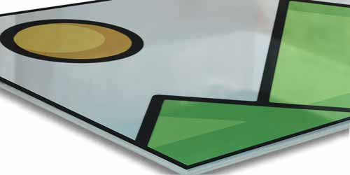 Für Frontbeleuchtung: Das Motiv wird auf eine glasklare Folie gedruckt und von hinten auf das ESG-Glas kaschiert. Die Rückseite wird mit eienem weißen Folienlaminat hinterlegt. Die Farben leuchten intensiv und brillant, ideal für Räume mit Tageslicht oder direkter Beleuchtung von vorne.